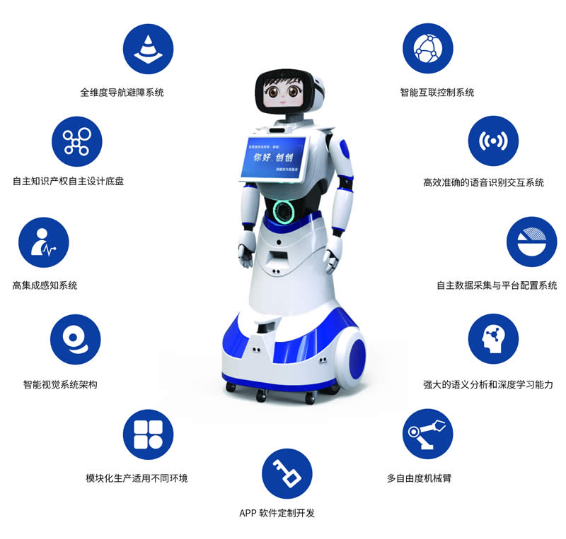 基于人工智能(Al)和機器學習(ML)技術L域的突破,經過精細調研與充分論證,確保機器人控制智能、性能穩定,通過不斷地創新研發,重新定義服務機器人。智能商用服務機器人"創創" 集視覺、聽覺、觸覺、自由行走干—體。 可廠泛用于政符、金G、展館展廠工、教育、醫療、圖書館、商招、昌等L域。滿足客廣多元化需求。 "創創" 率先實現了把機器人的"大腦"和"小腦"完全向客戶開放,由止此可以迅速學習各個行業的專業知識并成為各個行業的專家。"創創"是您的小助手,好朋友!