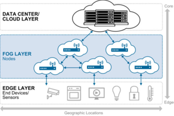 霧計(jì)算是一種新興的計(jì)算范式,它使計(jì)算、存儲(chǔ)、網(wǎng)絡(luò)、加速、分析和管理控制更接近于網(wǎng)絡(luò)的邊緣。它的名字來源于這樣一個(gè)事實(shí):云在GG的天空,霧則離地面更近。霧計(jì)算的關(guān)鍵是,云(或核心中的企業(yè)服務(wù)器)與物聯(lián)網(wǎng)設(shè)備之間包含一個(gè)霧層,如圖1所示。來自物聯(lián)網(wǎng)設(shè)備的事件被發(fā)送到靠近網(wǎng)絡(luò)邊緣的霧節(jié)點(diǎn)。
