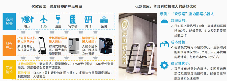 普渡科技綜合了SLAM、智能導航避障、多機調度、人機交互等人工智能技術,為餐廳、酒店、樓宇等廣泛場景提供配送機器人解決方案,在G動態的商業環境下準確建圖和定位,實現G效運行,優化餐飲服務作業流程,降低企業成本。公司產品目前已應用于海底撈、巴奴火鍋、旺順閣、美 心、洲際酒店、喜來登酒店、萬達集團等國內知名餐飲、酒店企業,截止2019年6月公司銷售的機器人已累計運行50萬公里。未來普渡科技的產品 將多面覆蓋迎賓、L位、送餐、回盤等餐飲服務環節,并通過IoT平臺實現遠程的自動運維和售后,為餐企提供更多面的智慧餐廳解決方案。