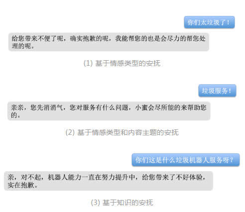 圖 5 給出了在線情感安撫的三個示例,分別對應上述的三種不同層面的回復機制。 表 2:需要安撫的情感分類效果對比