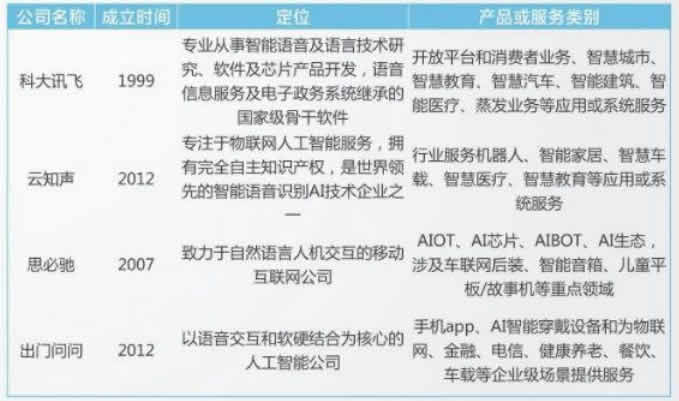 前國內的頭部技術供應商主要包括科大訊飛、云知聲、思必馳、出門問問等。它們均擁有自主核心科技,專注智能語音技術及輸出語音識別等應用。其中科大訊飛的語音識別技術能力強,市場占有率G。目前行業整體語音識別成功率已達較G水平,但在 具體落地時仍然會存在諸如語音交互效果受周圍環境影響較大、溝通方式不夠人性化等問題,因此仍需在場景應用層面繼續改善。