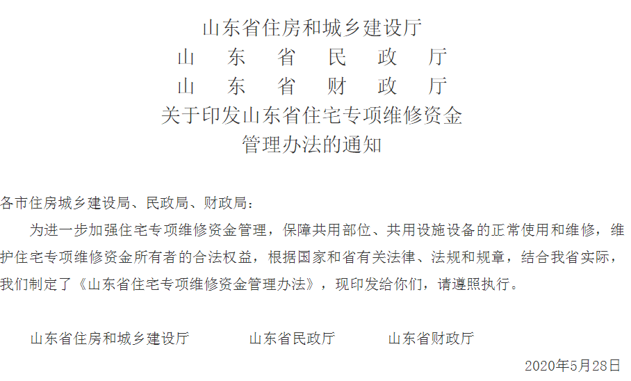 為進一步加強住宅專項維修資金管理,維護維修資金所有者的合法權益,山東省住房和城鄉建設廳、山東省民政廳、山東省財政廳聯合印發《山東省住宅專項維修資金管理辦法》