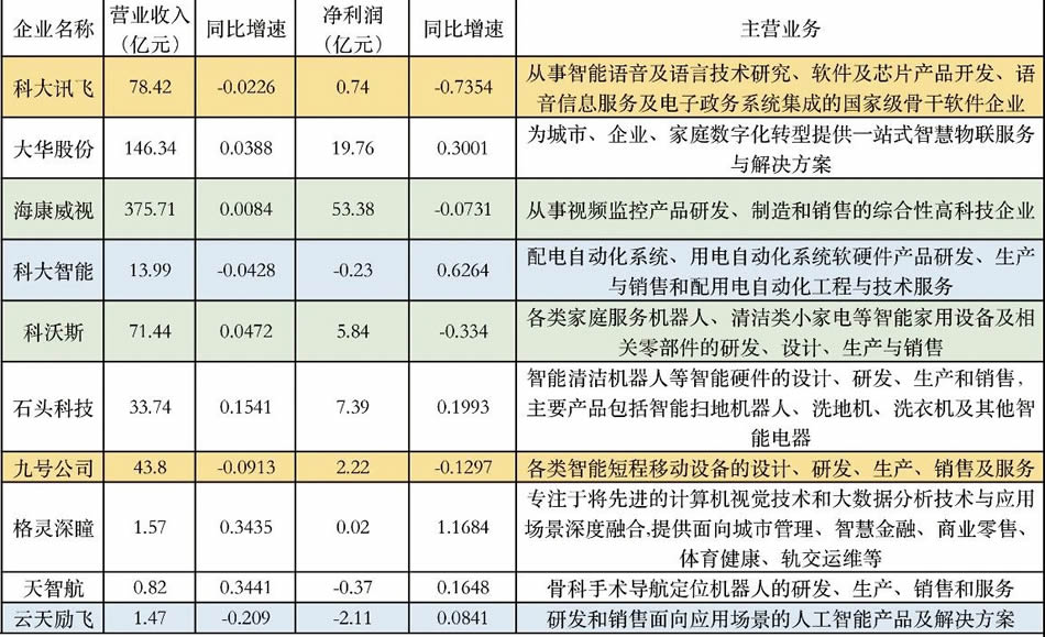 依然以營收和凈利潤兩個指標來界定,4家雙增的企業(yè)有大華股份、石頭科技、格靈深瞳、天智航;2家雙降的企業(yè)有科大訊飛、九號公司;4家單降的企業(yè)有海康威視、科大智能、科沃斯、云天勵飛。