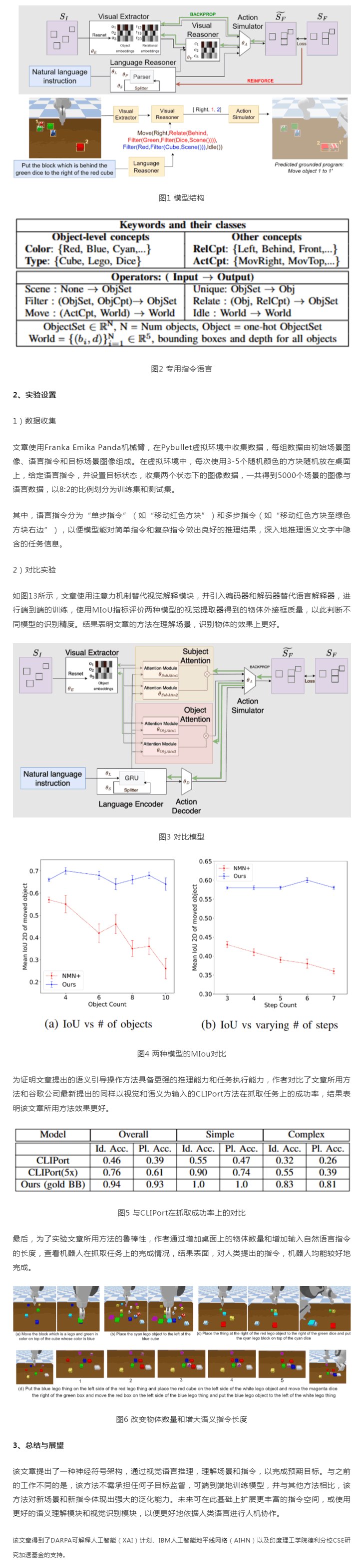 該文章提出了一種新型神經(jīng)符號模型,使用自然語言推理目標(biāo)場景,實(shí)現(xiàn)在給定初始場景和目標(biāo)場景的情況下即可學(xué)習(xí)執(zhí)行復(fù)雜的操作任務(wù),并展示了如何在不需要任何中間監(jiān)督的情況下,僅使用初始與目標(biāo)兩個場景作為監(jiān)督來獲取機(jī)器人操作動作的密集表示。 實(shí)驗(yàn)表明,該文章的方法可通過端到端的訓(xùn)練而不需進(jìn)行任何子目標(biāo)監(jiān)督,即可展現(xiàn)出強(qiáng)大的指令理解能力,并對新場景和指令展現(xiàn)出強(qiáng)大的泛化能力,為將來基于自然語言的人機(jī)協(xié)作,機(jī)器人的語義指令集的拓展提供了新的參考思路。