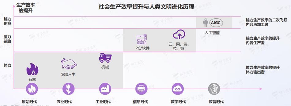人類文明演進依次走過了原始時代、農(nóng)業(yè)時代、工業(yè)時代、信息時代、數(shù)字時代,到今天的數(shù)智時代,每個時代的代表性生產(chǎn)工具都不同。所有 生產(chǎn)工具反映的都是生產(chǎn)效率的提升能力。數(shù)字時代的云、網(wǎng)、端、芯、鏈等數(shù)字工具,除了體力效率的提升之外,還有腦力效率的輔助作用, ChatGPT所代表的AIGC工具的出現(xiàn),標志著人類生產(chǎn)效率出現(xiàn)了D二次腦力效率飛躍,是新一輪生產(chǎn)力的躍遷,真正實現(xiàn)從體力效率提升向腦力 效率提升的轉(zhuǎn)變,這將推動人類社會發(fā)生深遠變革,其意義不亞于新時代的蒸汽機。