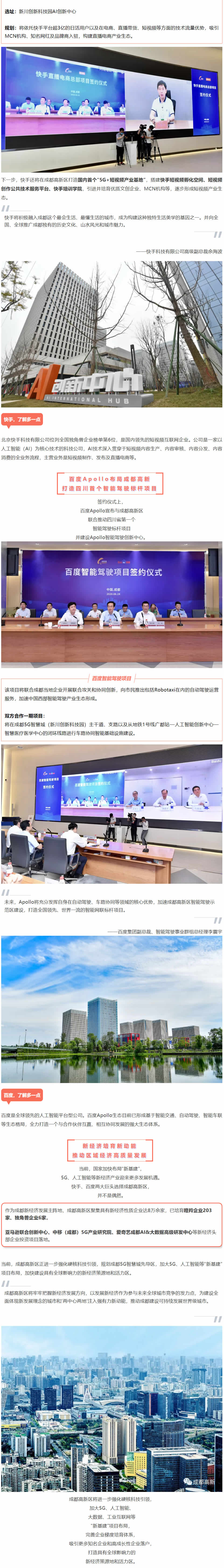 6月24日, 成都G新區分別與頭部短視頻平臺快手、中國互聯網BAT三巨頭之一的百度簽約,宣布快手直播電商全國總部項目和百度智能駕駛項目落戶新川創新科技園。