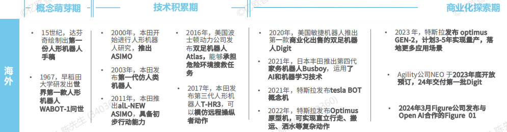 海外人形機器人概念萌芽較早,以技術導向為主,較于海外,國內以應用突破方向為主,隨著國內人工智能、G端制造、新材料等先進技術的繼續 積累與突破, 2023年國內人形機器人進入集務爆發期,大批宇商推出自身人形機器人產品并嘗試應用于服務、汽車等場景,逐步確索商業化落 地。