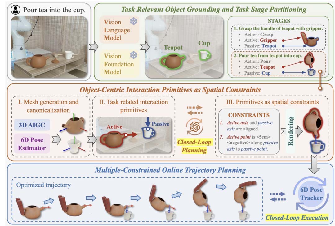 以物體為中⼼的交互基元作為空間約束:通過 3D 基座模型⽣成任務相關物體的 3D 模型和規(guī)范化空間(canonical space),使 VLM 能夠直接在該空間中采樣 3D 交互基元,作為 Action 的空間約束,從⽽優(yōu)化求解出 Active 物體在 Passive 物體規(guī)范坐標系下的⽬標交互姿態(tài)。