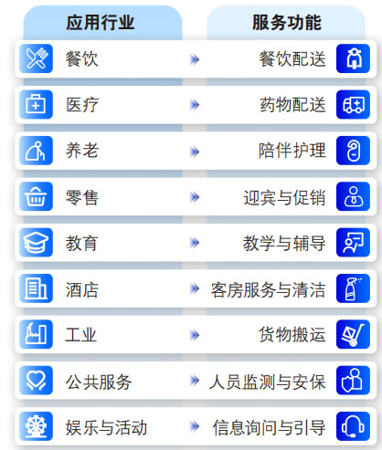 伴隨著技術的進步和市場需求的不斷提升 ,服 務機器人的應用邊界正日益拓寬 ,從Z初的單 一行業擴展到多個領域 ,涉及餐飲、零售、酒 店、醫療、養老、娛樂體育、工業、教育和公 共服務等。服務機器人需要再跨場景中完成復 合型任務,從專用邁向通用成為必然趨勢。