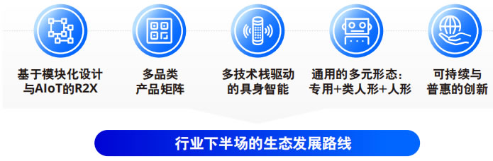 開放性的全棧式智能服務(wù)機(jī)器人生態(tài)的發(fā)展 路線是一個(gè)多維度、跨領(lǐng)域的綜合性戰(zhàn)略, 進(jìn)入行業(yè)下半場 ,服務(wù)機(jī)器人正沿著一條創(chuàng) 新的發(fā)展道路前進(jìn) 。這條道路的實(shí)現(xiàn)需要依 靠多種戰(zhàn)略的發(fā)展 ,其中包括了以模塊化設(shè) 計(jì)和AIoT技術(shù)為基礎(chǔ) ,構(gòu)建起R2X (Robot-to- Everything),即機(jī)器人與萬物互聯(lián),使得機(jī)器 人能夠靈活地與周圍環(huán)境和設(shè)備進(jìn)行交互。在 這一生態(tài)中 ,專用、類人形和人形機(jī)器人三種 形態(tài)相輔相成 ,不可替代 ,共同構(gòu)成了機(jī)器人 行業(yè)的未來生態(tài) ,以適應(yīng)各種場景和任務(wù)。而 這背后 ,是多技術(shù)棧的驅(qū)動力 ,它們集成了自 主移動、操作和交互等關(guān)鍵技術(shù) ,賦予機(jī)器人