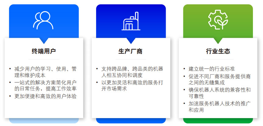 對(duì)于用戶而言,開放性的全棧式智能服務(wù)機(jī)器人生態(tài)意味著更加便捷和高效的用戶體驗(yàn)。統(tǒng) 一的操作系統(tǒng)減少了學(xué)習(xí)、使用、管理和維護(hù) 的成本,大幅提升了客戶體驗(yàn);用戶可以輕松 地控制和管理多種服務(wù)機(jī)器人,無需為每個(gè)設(shè) 備學(xué)習(xí)不同的操作方式。這種一站式的解決方 案簡化了用戶的日常任務(wù),提高了工作效率, 同時(shí)也降低了維護(hù)和修理的復(fù)雜性,為客戶帶 來更高的使用價(jià)值。