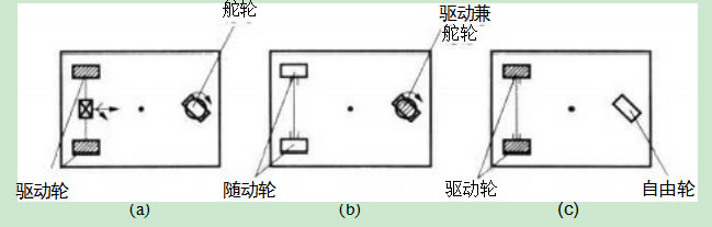 輪配置中也有一些很少見的配置方式,如圖2-1-6所示,圖2-1-6(a) 中 三 個 輪互成120°。車輪不僅可d立驅動而且可以d立轉向;圖2-1-6(b) 三個車輪采用 同步驅動系統控制,三個車輪同時用來驅動與轉向,這種機器人一個突出的特點是機器人本體相對于地面的姿態保持不變;圖2-1-6(c) 互成120°布置的三個車輪采用瑞典輪,通過d立驅動各輪可實現機器人全方位移動。