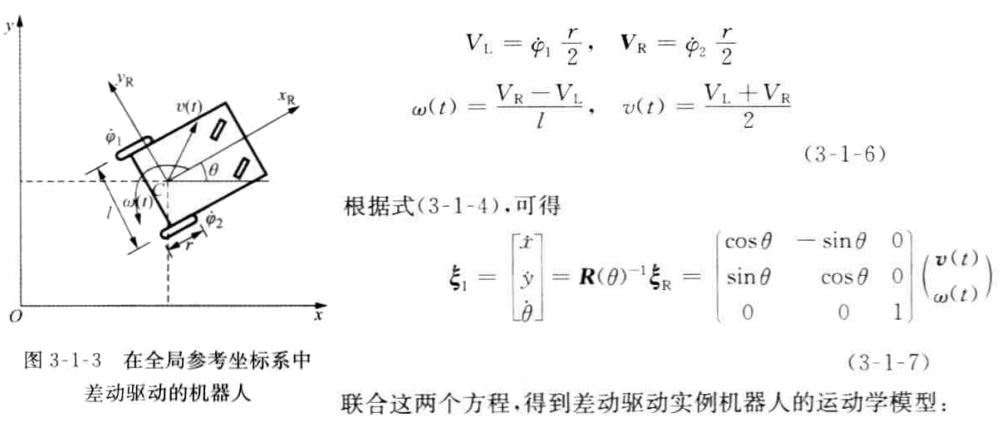 先,我們討論如圖3-1-3所示的雙輪差速驅(qū)動的移動機器人的運動學模型, 即討論給定機器人的幾何特征和它的輪子速度后,機器人的運動方程。