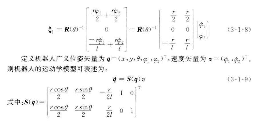 假定機器人在運動中質(zhì)心的線速度為v(t), 角速度為w(t), 左右兩輪的轉(zhuǎn)速分別為ψ和 中₂,機器人左右兩輪的運動速度分別為 VI, VR。給定r,1,θ, 以及根據(jù)圖3-1-3所示的幾 何關(guān)系,考慮到移動機器人滿足剛體運動規(guī) 律,下面的運動學方程(3-1-6)成立。