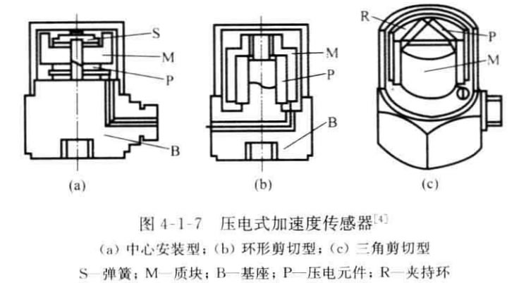 常用的壓電式加速度計的結構形式如圖4-1-7所示。圖中(a) 是安裝壓 縮型,壓電元件 一質量塊 一 彈簧系統裝在圓形中心支柱上,支柱與基座連接。這種 結構有高的共振頻率。然而基座B 與測試對象連接時,如果基座 B 有變形則將直 接影響拾振器輸出。此外,測試對象和環境溫度變化將影響壓電元件,并使預緊力 發生變化,易引起溫度漂移。圖(c) 為三角剪切形,壓電元件由夾持環將其夾牢在 三角形中心柱上。加速度計感受軸向振動時,壓電元件承受切應力。這種結構對 底座變形和溫度變化有極好的隔離作用,有較高的共振頻率和良好的線性。圖(b) 為環形剪切型,結構簡單,能做成極小型、高共振頻率的加速度計,環形質量塊粘到 裝在中心支柱上的環形壓電元件上。由于粘結劑會隨溫度增高而變軟,因此Z高 工作溫度受到限制。