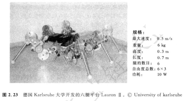 由于行走期間的靜態(tài)穩(wěn)定性,六腿結(jié)構(gòu)在移動機器人學(xué)中已經(jīng)很流行(圖2.23 和圖1.3),因而降低了控制的復(fù)雜性。在大多數(shù)情況下,各條腿有3個自由度,包括
