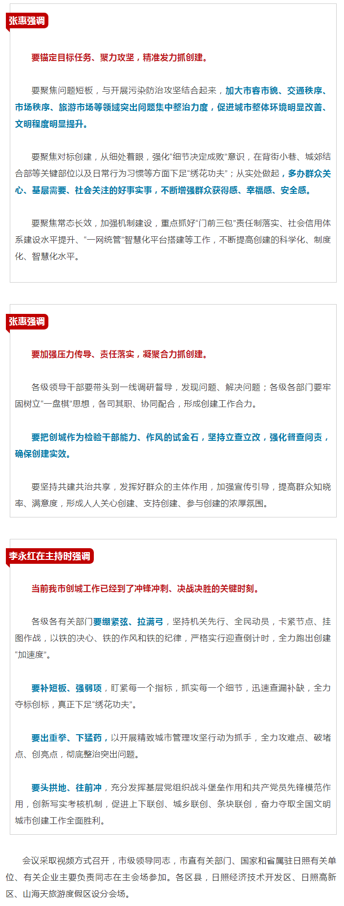 市委書記張惠講話,市委副書記、市長李永紅主持,市政協主席王斌,市人大常委會主任G杰,市委副書記李在武出席,市委常委、統戰部長楊留星通報創城模擬測評情況。東港區、嵐山區、日照經濟技術開發區、日照G新區、山海天旅游度假區、市城市管理局、市市場監管局、市公安局交警支隊負責同志作表態發言。