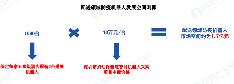 酒店場(chǎng)景下的初始客戶主要為G檔酒店,假設(shè)全國每一家五星級(jí)酒店均配備2臺(tái)送餐機(jī)器人,按照平均每臺(tái)10萬元的價(jià)格計(jì)算,酒店服務(wù)場(chǎng)景下,防疫機(jī)器人的市場(chǎng)空間約為1.7億元。