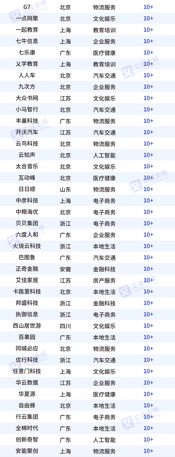 字節跳動,螞蟻金服,滴滴出行,快手,陸金所,菜鳥網絡,京東數科,微眾銀行,馬上金融,商湯科技,京東物流,曠視科技,優必選