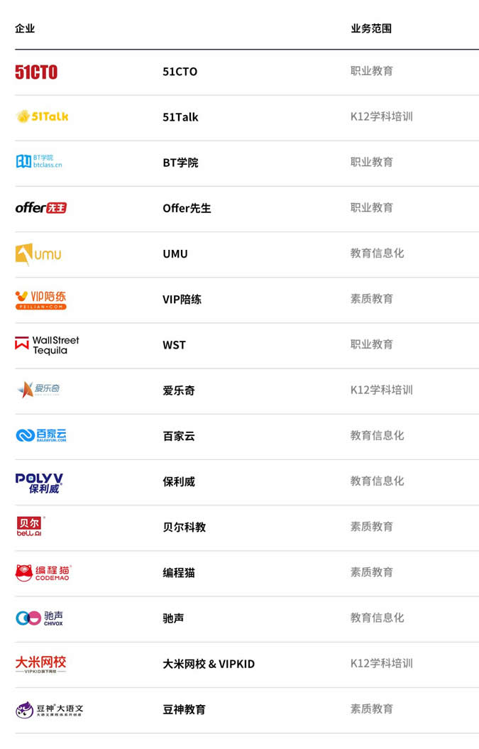 掌門教育、好未來,新東方在線、說客英語、猿輔導、跟誰學,有道,大米網校,作業幫,輕輕教育,51talk,愛樂奇,悉之教育,卓世未來