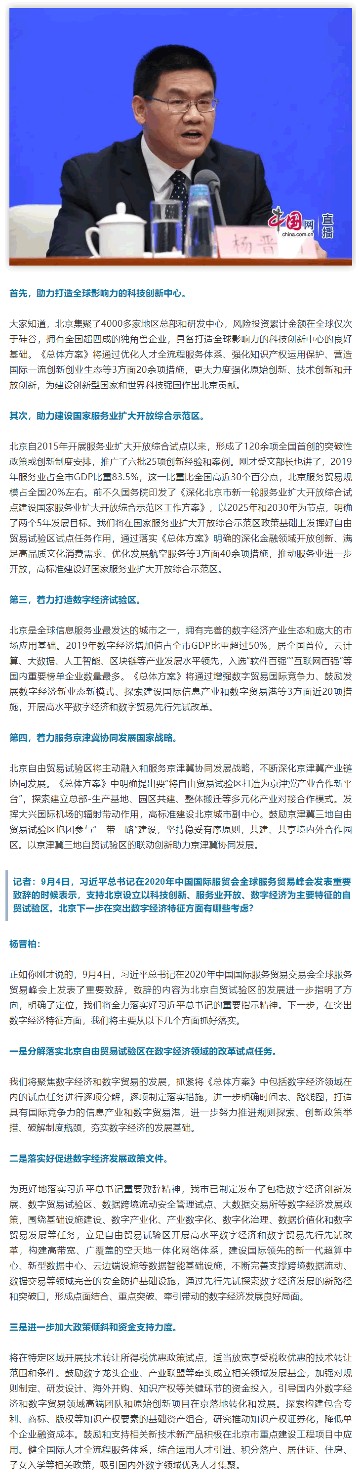 9月4日總書記在2020年中國國際服務貿易交易會服務貿易峰會上發表重要致辭,將支持北京打造國家服務業擴大開放綜合示范區,設立以科技創新、服務業開放、數字經濟為主要特征的自由貿易試驗區,構建京津冀協同發展的G水平開放平臺,帶動形成更G層次改革開放新格局。近日,國務院印發了《中國(北京)自由貿易試驗區總體方案》(以下簡稱《總體方案》)。這些都充分體現了以同志為核心的黨對首都工作的G度重視和巨大關懷,也為北京市進一步深化改革、擴大開放,推動經濟G質量發展指明了方向。對此我們感到責任重大、使命光榮。北京自由貿易試驗區總體方案的亮點和特色,歸納起來主要有四個方面。