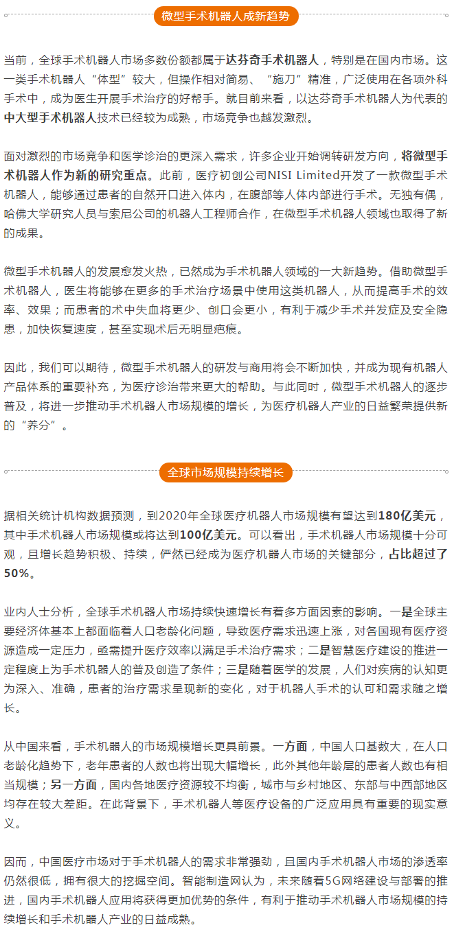 傳統(tǒng)的手術(shù)方式存在著準確度、耗費時長、視野角度等多方面問題,而手術(shù)機器人的應(yīng)用可以很好地解決上述難點。通過手術(shù)機器人來輔助進行手術(shù),具有準確度G、出血量少、創(chuàng)傷面小、恢復(fù)速度快等優(yōu)勢,得到了醫(yī)生、患者