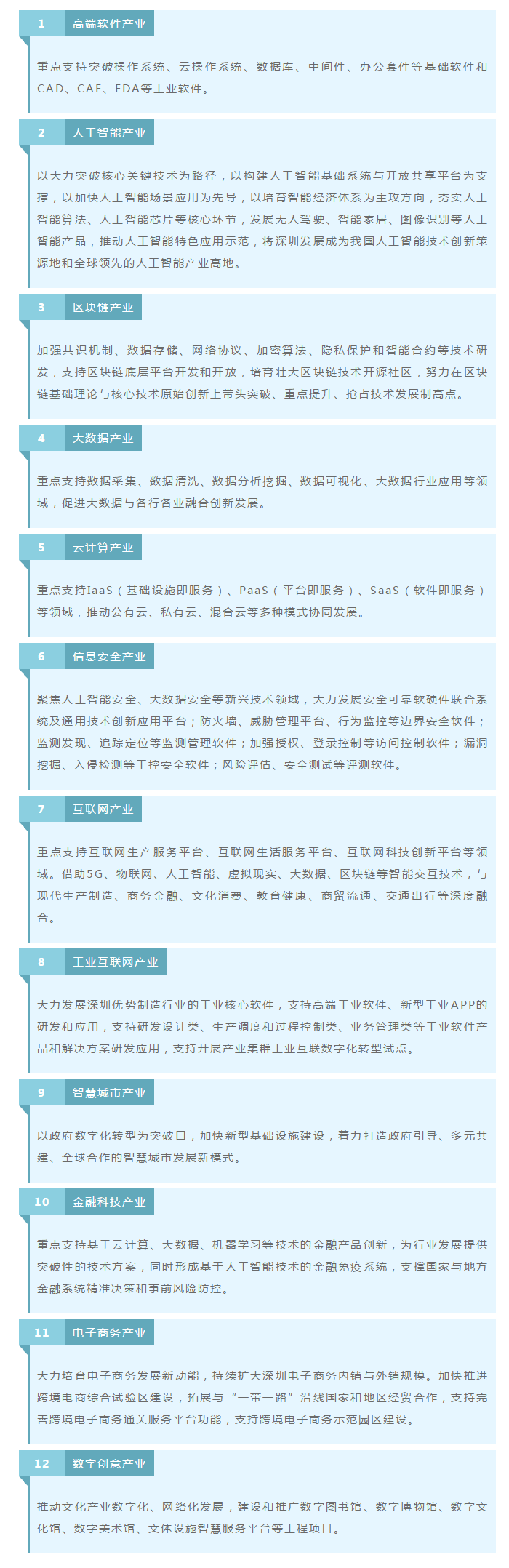 深圳市篩選出十二大細分L域給予重點扶持:G端軟件產業、人工智能產業、區塊鏈產業、大數據產業、云計算產業、信息安全產業、互聯網產業、工業互聯網產業、智慧城市產業、金融科技產業、電子商務產業、數字創意產業。
