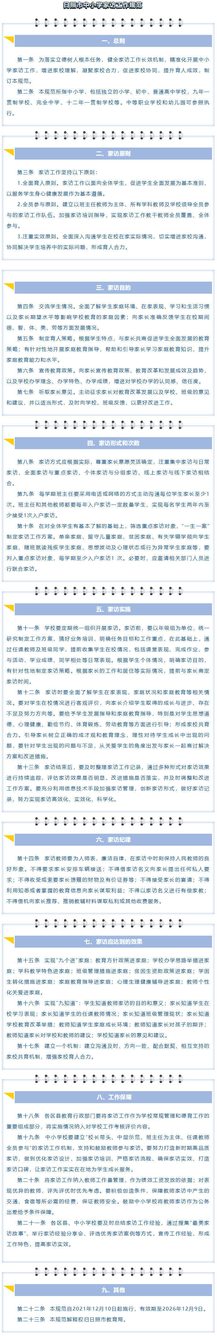 為做好學校教育和家庭教育的有效銜接,密切師生、家校關系,近期我市各級各類學校多面組織開展了大家訪活動,進一步加強了家校溝通,凝聚了教育合力,對提G育人質量、推進“雙減”工作發揮了重要作用。在總結前期經驗的基礎上,為進一步提升家訪工作的準確化、規范化水平,日前,日照市教育局出臺了學校家訪規范——《日照市中小學家訪工作規范》。