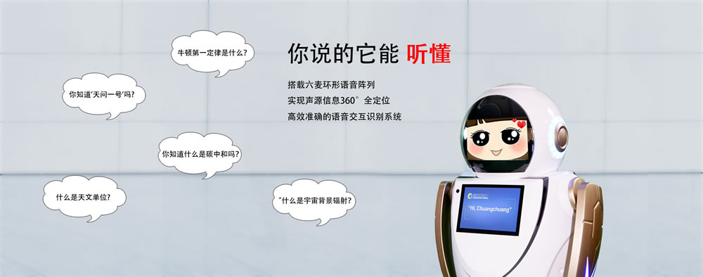 迎賓接待智能機器人具備語音識別功能,可回答用戶提出的眾多問題,回答內容可以定制,機器人則用幽默的語言回答賓客提問產生良好的互動效果