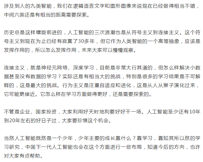 第三個是跨媒體智能,要把聲音、圖像、文字、自然語言所有這些東西聯(lián)結(jié)在一起來研究智能,這是跨媒體智能未來所希望達(dá)到的目標(biāo)。