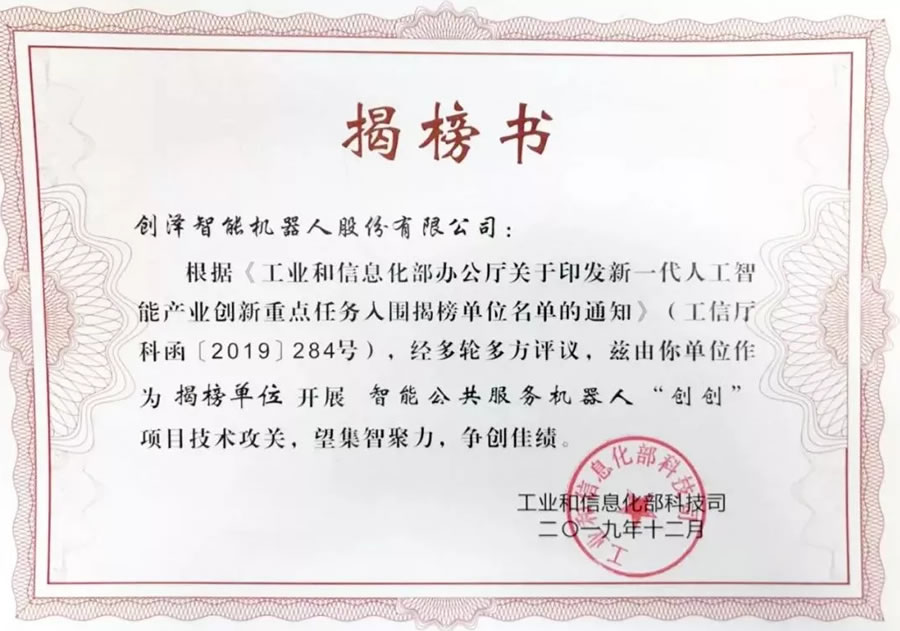 近日,中國工業和信息化部辦公廳印發新一代人工智能產業創新重點任務入圍揭榜單位名單的通知,創澤智能機器人集團股份有限公司以智能公共服務機器人“創創”項目成功入圍揭榜企業,助力我國人工智能產業創新發展。