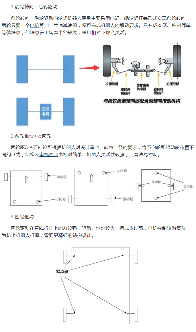 輪式機(jī)器人底盤主要有前輪轉(zhuǎn)向后輪差速驅(qū)動、兩輪驅(qū)動+萬向輪、四輪驅(qū)動之分。