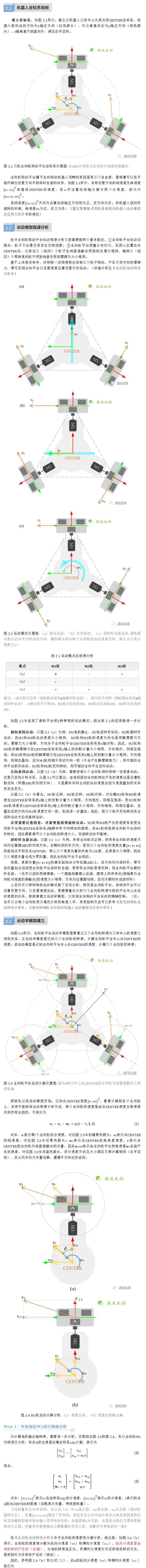 全向輪移動平臺因其機動、靈活的特點而備受關注,本文深入分析全向輪的運動機理及其全向輪平臺運動過程中的受力和速度情況,先后分析全向輪平臺的3種運動模式及其內在運動規律;并采用速度分解的方法,詳細分析了電機轉速-全向輪實際運動速度-全向輪平臺中心點速度之間的關系,給出完整的物理分析及數學推導過程,構建全向輪平臺的運動學模型;后從速度空間、運動效率等方面分析全向輪平臺的適用場景。