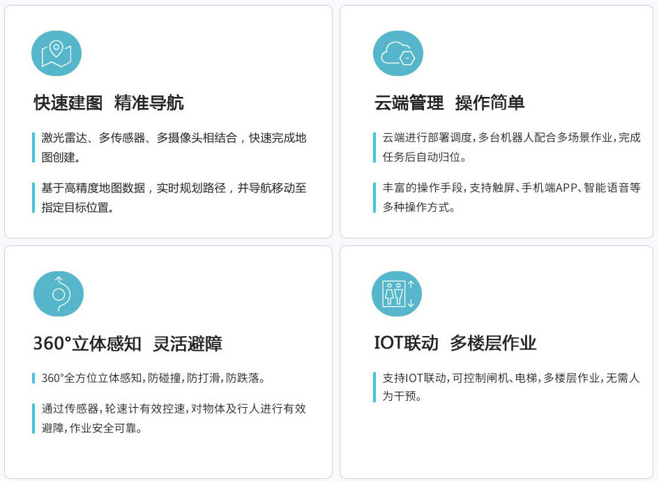 多重傳感器融合,自動靈活避障,防撞,防打滑,安全可靠