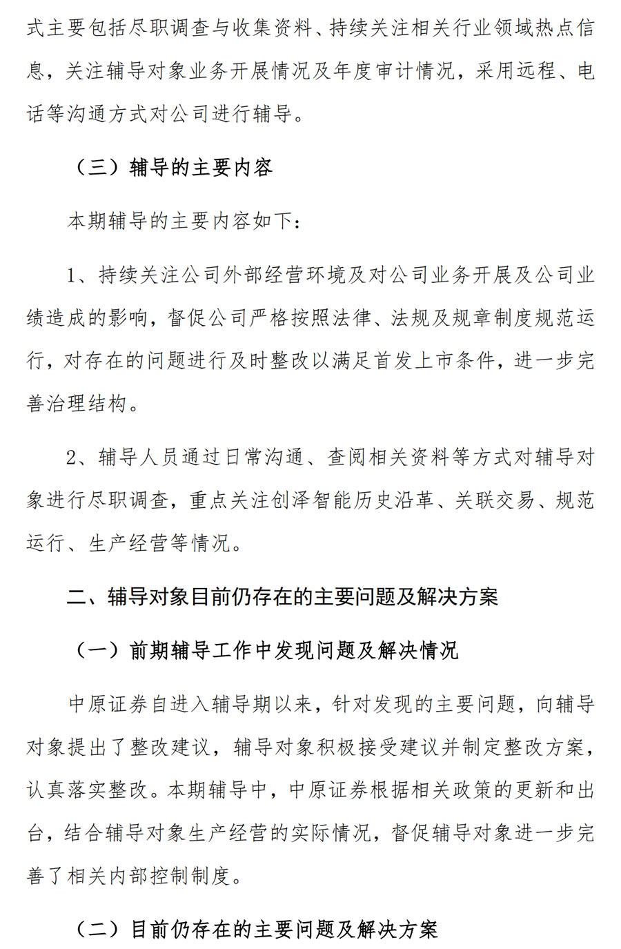 2、輔導(dǎo)人員通過(guò)日常溝通、查閱相關(guān)資料等方式對(duì)輔導(dǎo)對(duì)象進(jìn)行盡職調(diào)查,重點(diǎn)關(guān)注創(chuàng)澤智能歷史沿革、關(guān)聯(lián)交易、規(guī)范運(yùn)行、生產(chǎn)經(jīng)營(yíng)等情況。