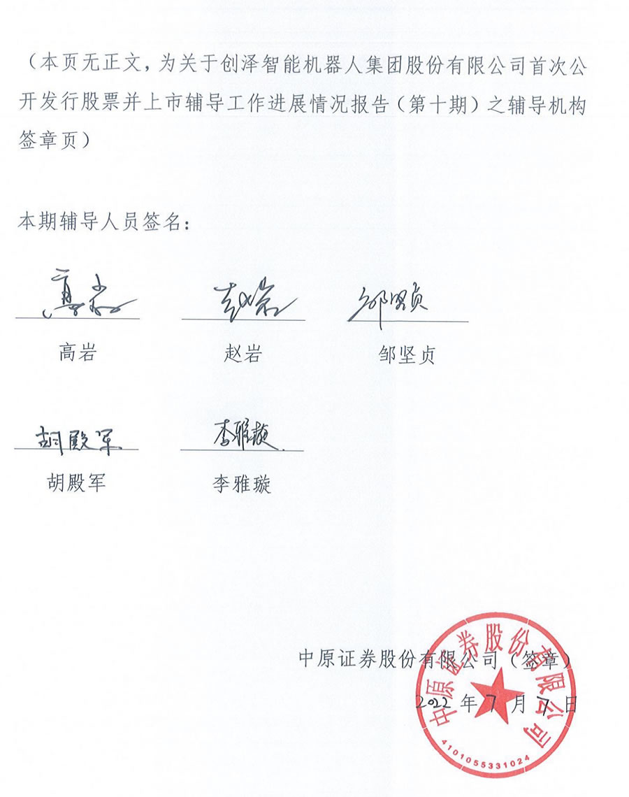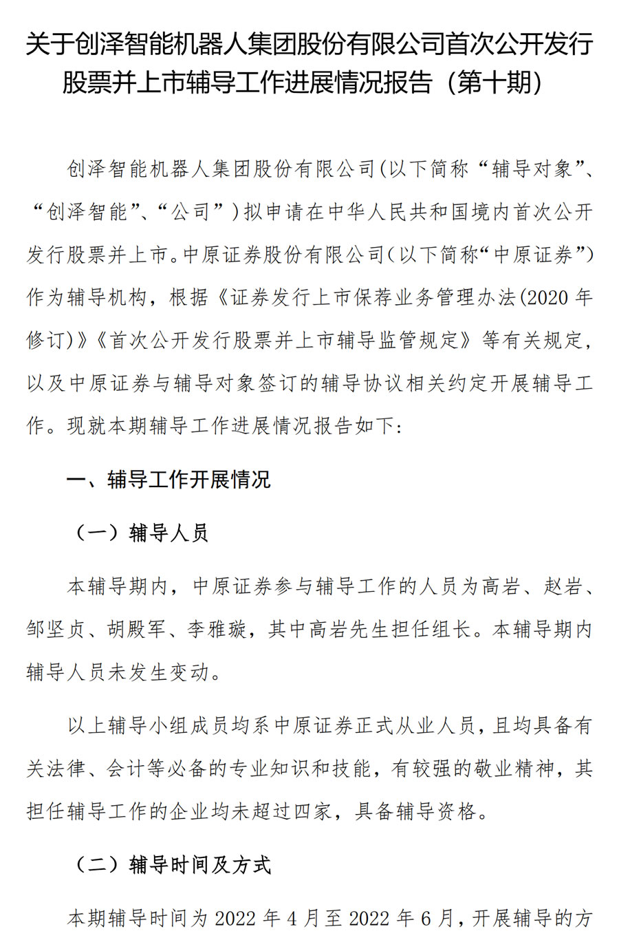 中原證券關(guān)于創(chuàng)澤智能機(jī)器人集團(tuán)股份有限公司首次公開(kāi)發(fā)行股票并上市輔導(dǎo)工作進(jìn)展報(bào)告