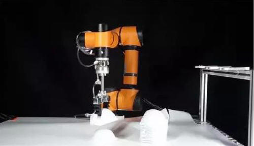 利用柔性抓取工具配合輕型協(xié)作機械臂,研發(fā)出N95口罩自動化分揀系統(tǒng),可以快速部署在口罩生產(chǎn)線上,代替人工分揀。