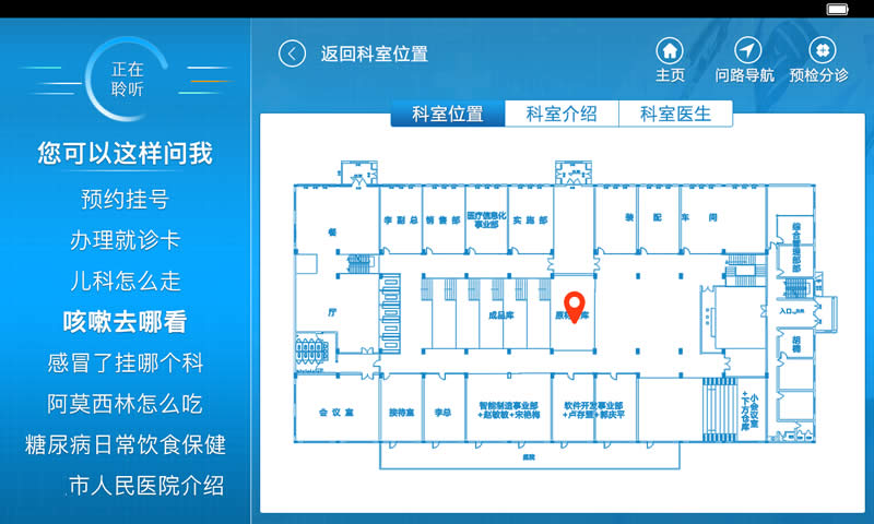 導診機器人提供醫院信息咨詢,接入藥品知識庫提供用藥使用咨詢;問路導航功能,記錄了醫院各個科室以及病房的位置為用戶提供帶路功能