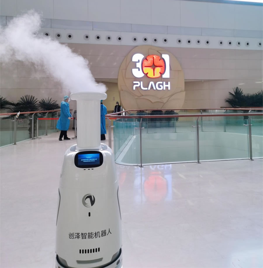 在中國人民解放軍總醫(yī)院D一醫(yī)學(xué)中心的門診大廳里,創(chuàng)澤智能消毒機器人頭D噴霧在醫(yī)院門診大廳走來走去進行全域消毒殺菌,實現(xiàn)消毒效果量化管理