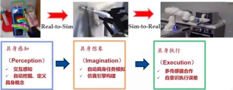 不僅僅理解行為,更需要能執(zhí)行行為,機(jī)器人能夠執(zhí)行行為才是真正理解行為。 通過計(jì)算機(jī)視覺以及行為認(rèn)知識別, 讓機(jī)器人能夠確認(rèn)和分辨一個(gè) 行為僅僅只是D一步,這也只是傳統(tǒng)旁觀式 AI 學(xué)習(xí)所達(dá)到的功能水平, 例如,傳統(tǒng) AI 學(xué)習(xí)可以讓機(jī)器學(xué)習(xí)"盒子,概念并在新的場景中說出 "盒子, 這個(gè)標(biāo)簽, 但在具身智能學(xué)習(xí)模式中, 機(jī)器通過感知環(huán)境實(shí)體, 通過親身體驗(yàn)完成具身學(xué)習(xí),終理解場景并形成"打開,這個(gè)概念。 因此, 當(dāng)機(jī)器可以執(zhí)行該行為才是具身智能的落腳點(diǎn)。