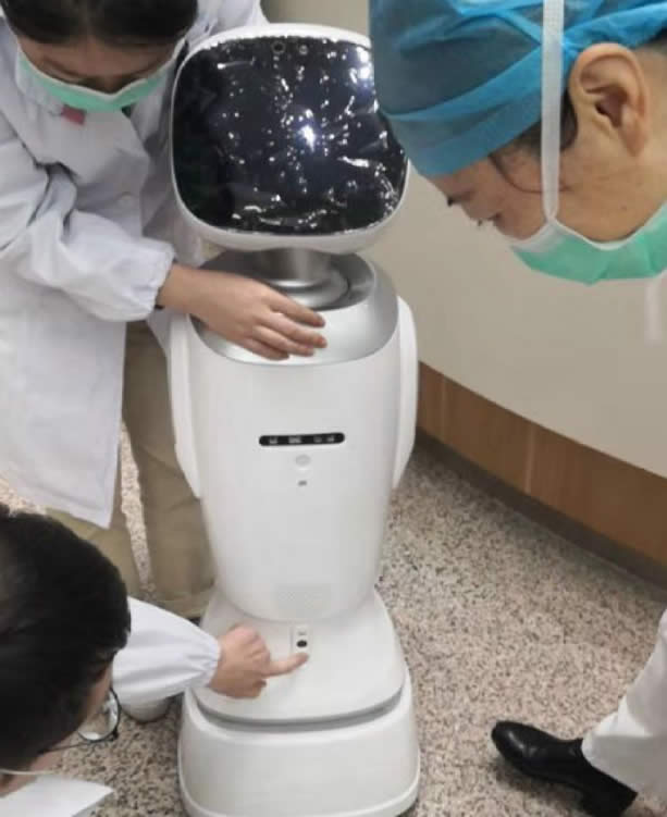 輪式移動機(jī)器人,融合了激光雷達(dá)智能 導(dǎo)航,超聲、紅外等自主避障、人臉識 別、智能語音對話、人臉跟隨等技術(shù)手段,提供迎賓、院內(nèi)指路帶路、疾病導(dǎo)診、業(yè)務(wù)咨詢、業(yè)務(wù)辦理等服務(wù)
