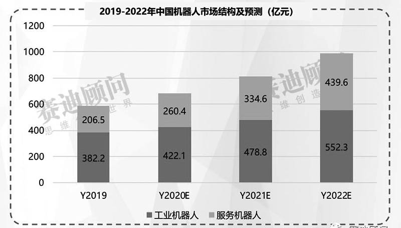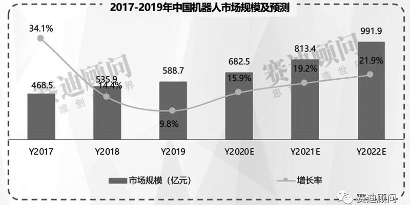 2019年,中國機器人市場規模持續增長,達588.7億元,增長率為9.8%,預計到2022年,市場規模將達到991.9億元,2020-2022三年復合增長率為19.0%。