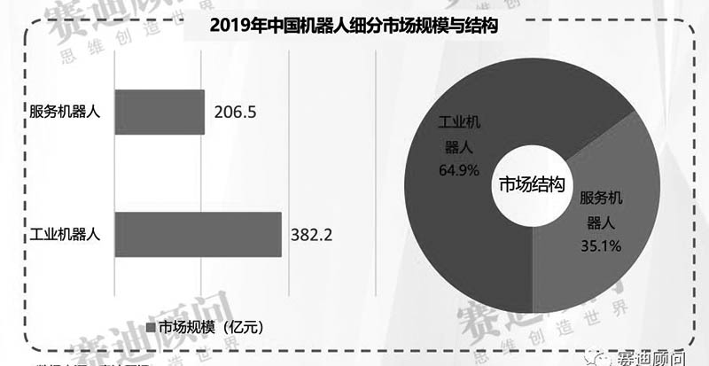 2019年,中國服務機器人市場規模為206.5億元,占整體機器人市場規模的35.1%,所占比例進一步提G,工業機器人市場規模為382.2億元,占比為64.9%。