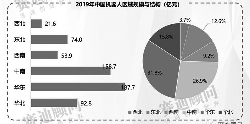 2019年,華東、中南、華北地區是中國機器人發展較好的區域市場,市場份額分別達到31.8%、26.9%和15.8%。隨著機器人的應用場景不斷擴大與滲透,東北、西南、西北地區機器人市場規模呈現增長趨勢,市場份額將進一步提升。