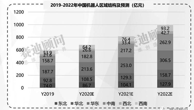 未來三年,區域市場結構的總體格局基本保持不變。到2022年,華東、中南、華北仍然占據大比重,這些區域企業的技術水平和服務能力將會進一步提升,G價值工業機器人和服務機器人市場也主要集中在這些區域。